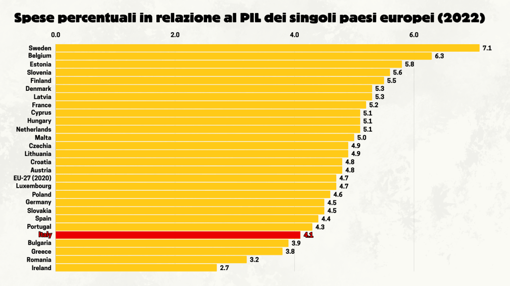 Secondo i dati Eurostat nel 2022, infatti, la spesa media UE per tale voce è stata pari al 4,7% del PIL. Con un valore del 4,1%, il nostro Paese si pone agli ultimi posti della classifica, superando esclusivamente Bulgaria (3,9%), Grecia (3,8%), Romania (3,2%) e Irlanda (2,7%). Questo una tabella che indica le relative spese percentuali in relazione al PIL dei singoli paesi europei.