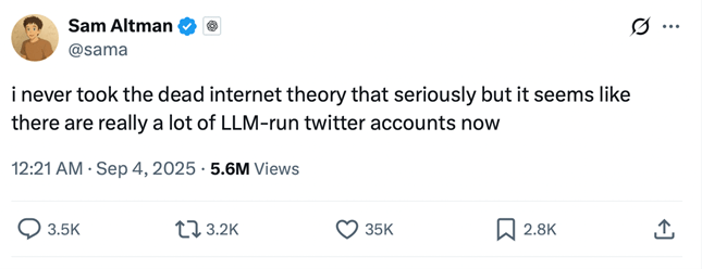 Risale a poco tempo fa il tweet di Sam Altman, CEO di OpenAI su X che ha riportato in voga la teoria della Dead of Internet (DIT) e ha acceso dibattiti e preoccupazioni attorno al tema del profondo impatto dell’AI sul web. La vicenda si inserisce in un contesto già di per sé acceso e in un clima di diffuso allarmismo attorno a questo hot topic.
